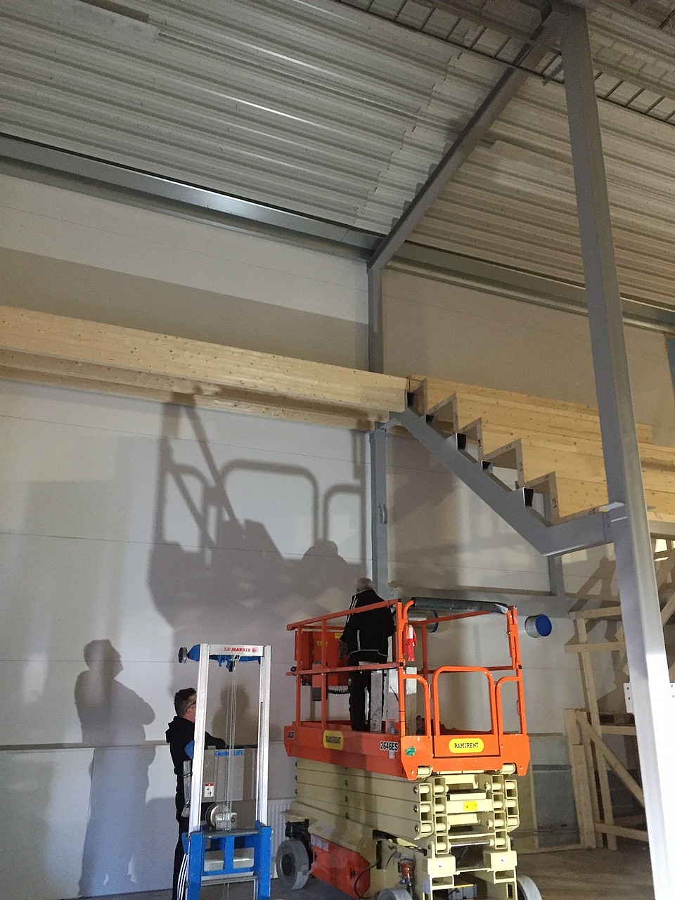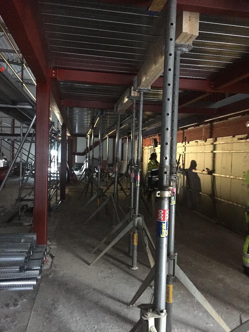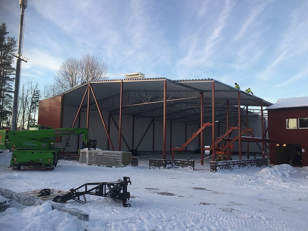 Idag har det hänt mycket, stålstommen är till hälften monterad + att ytterväggen i omklädningen är på plats.
