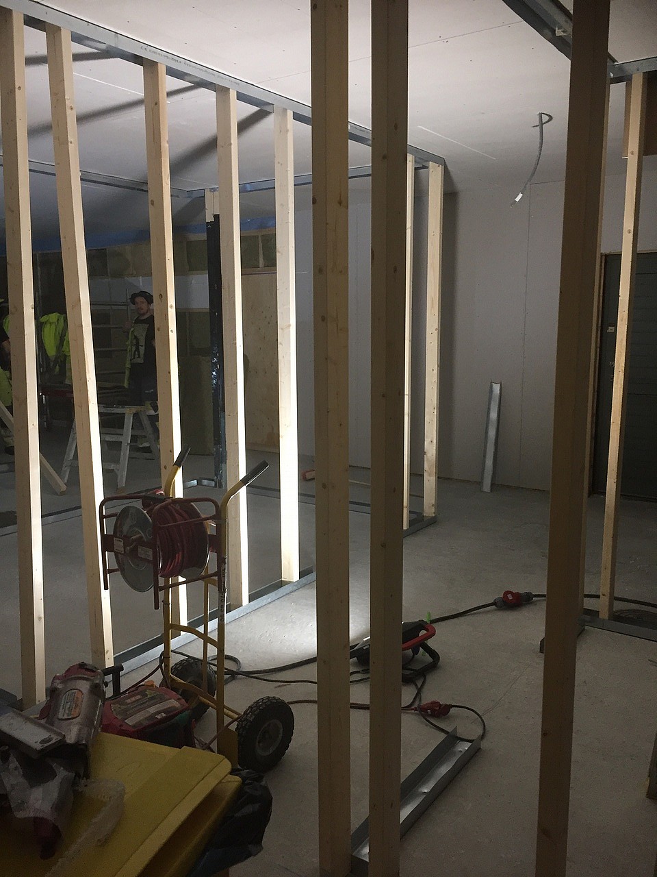 Innerväggarna i servicedel spikas och fasaden är nu komplett