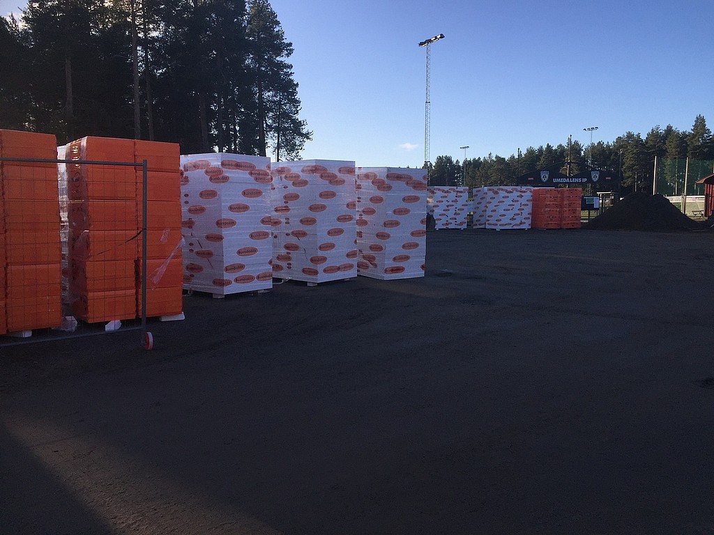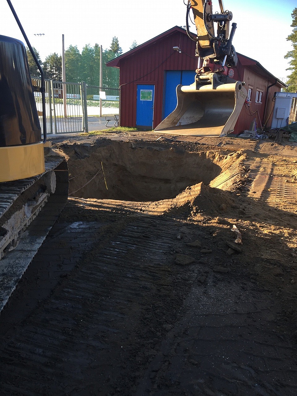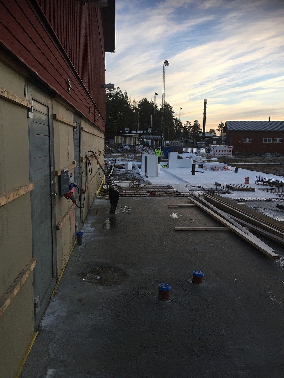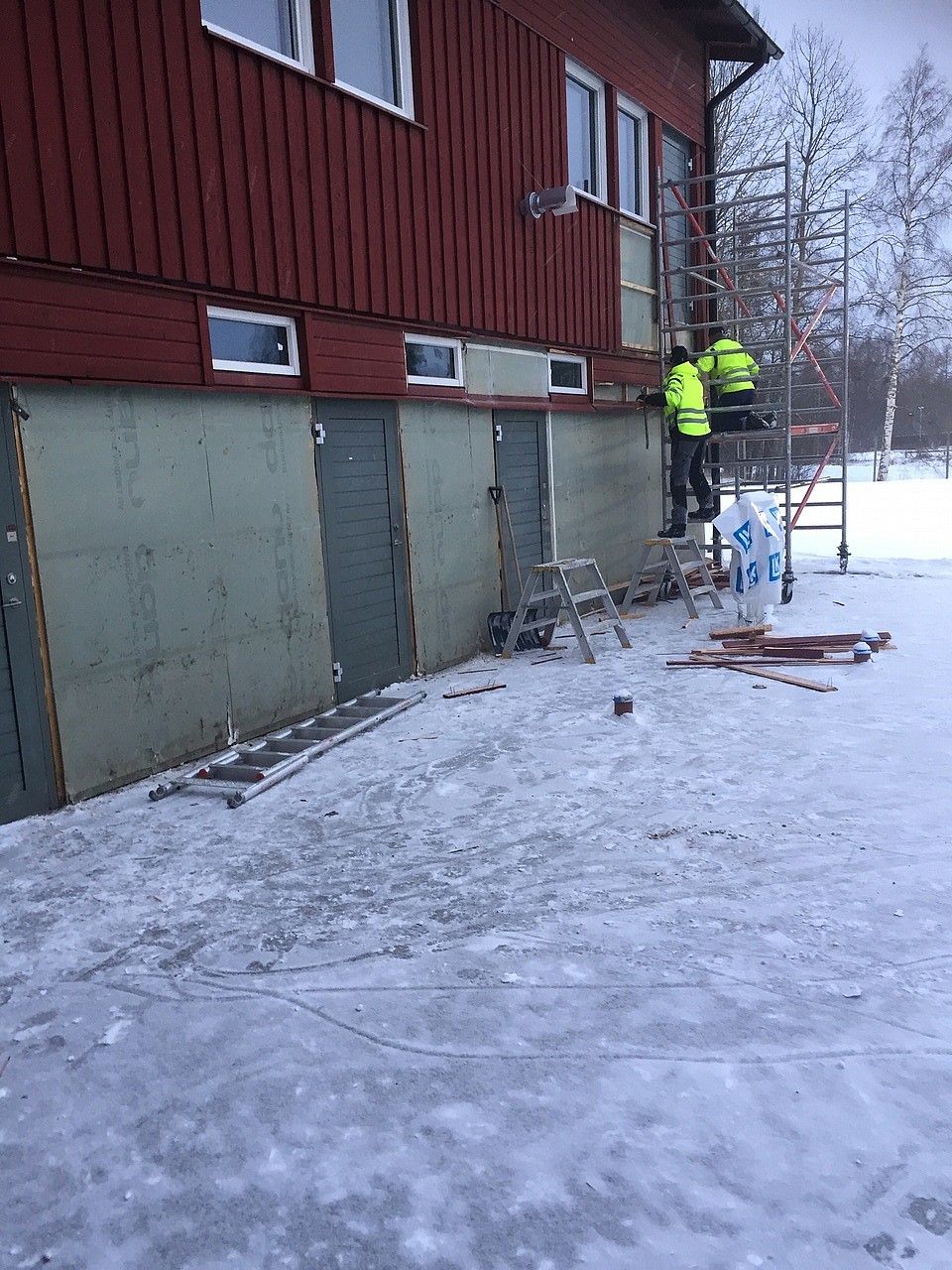 Nu åter upptas jobben efter en veckas stiltje. Fjärrvärmen ska grävas in och snickare börja spik på omklädningsdelen...