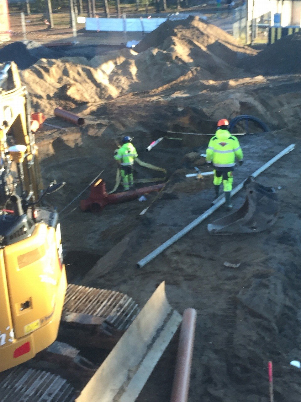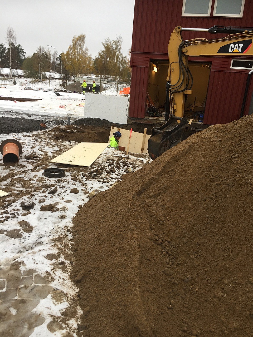 Efter några dagar utan bilder så drar det igång igen. Första transporten med stålstommen kom idag. Rivning av språng på gaveln för att ge plats för stålstommen. Fjärrvärmegraven fylls igen.