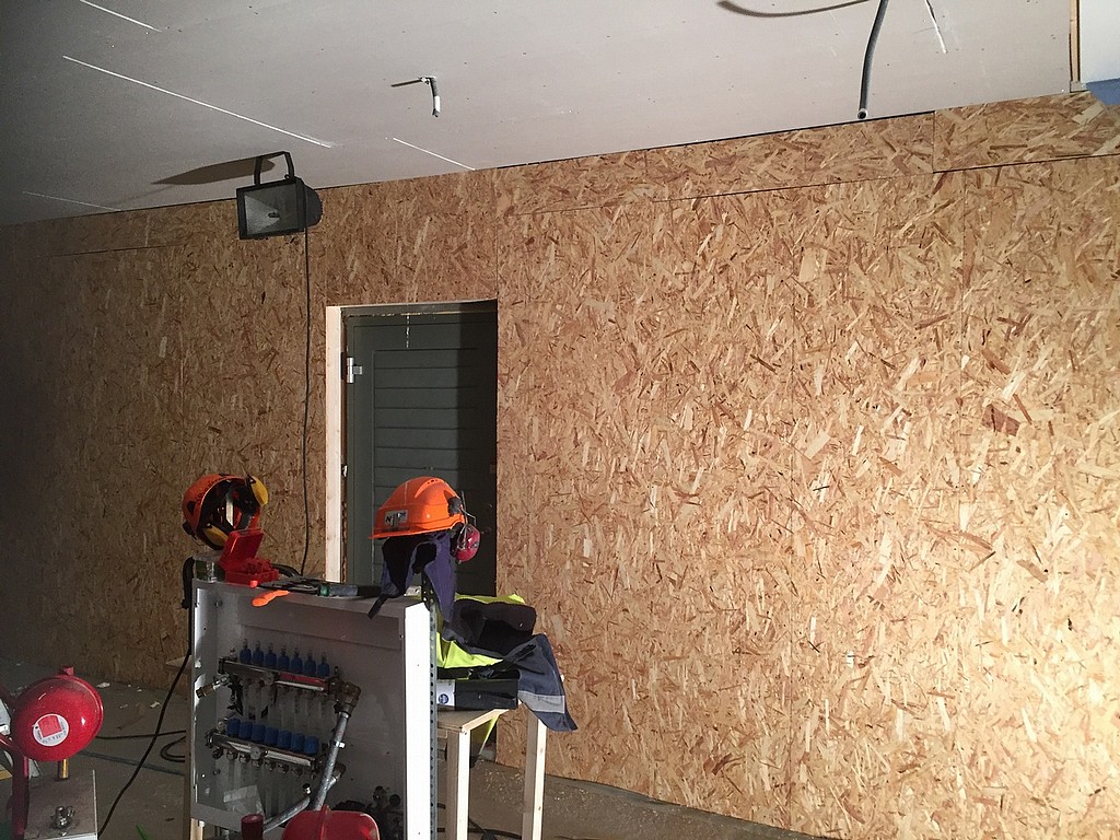 Spikning av väggblock och inkoppling av fjärrvärmen.